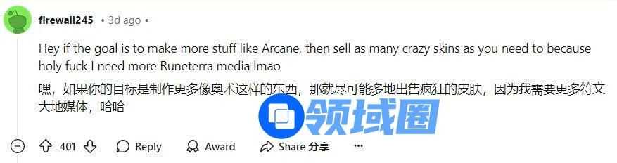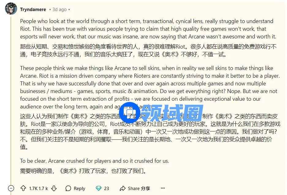 对于以上各种观点,拳头联合创始人Merrill在Reddit上回应了这些说法,他表示“那些用短期、交易和愤世嫉俗的眼光看待世界的人真的很难理解拳头,拳头做动漫不是为了卖皮肤,而是通过卖皮肤来做更多的动漫”。