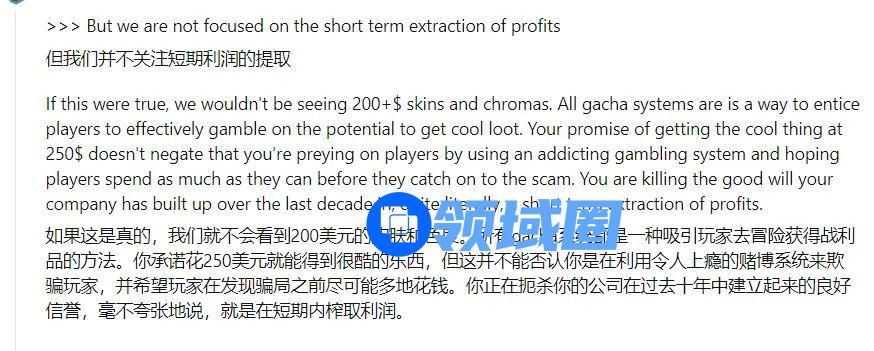 另一些玩家则抨击Merrill“虚伪”,认为推出250美元一款皮肤这样的事情就是在“短期内牟取利润”,只是没人买账所以换上一副“卖情怀”的样子来博同情。还有些玩家比较客观中立——动漫我会看,但皮肤我不买。