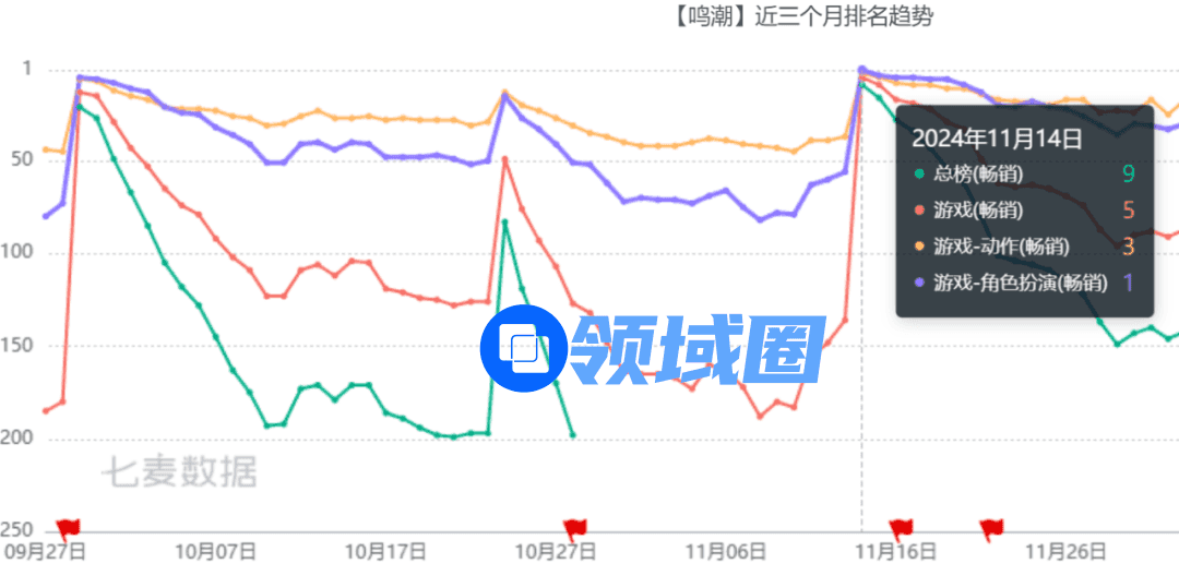 拿最近的数据来说,据七麦数据显示,伴随着共鸣者 “椿”的正式上线,《鸣潮》1.4版本于11月14日一举进入iOS国区游戏畅销榜第五的位置。