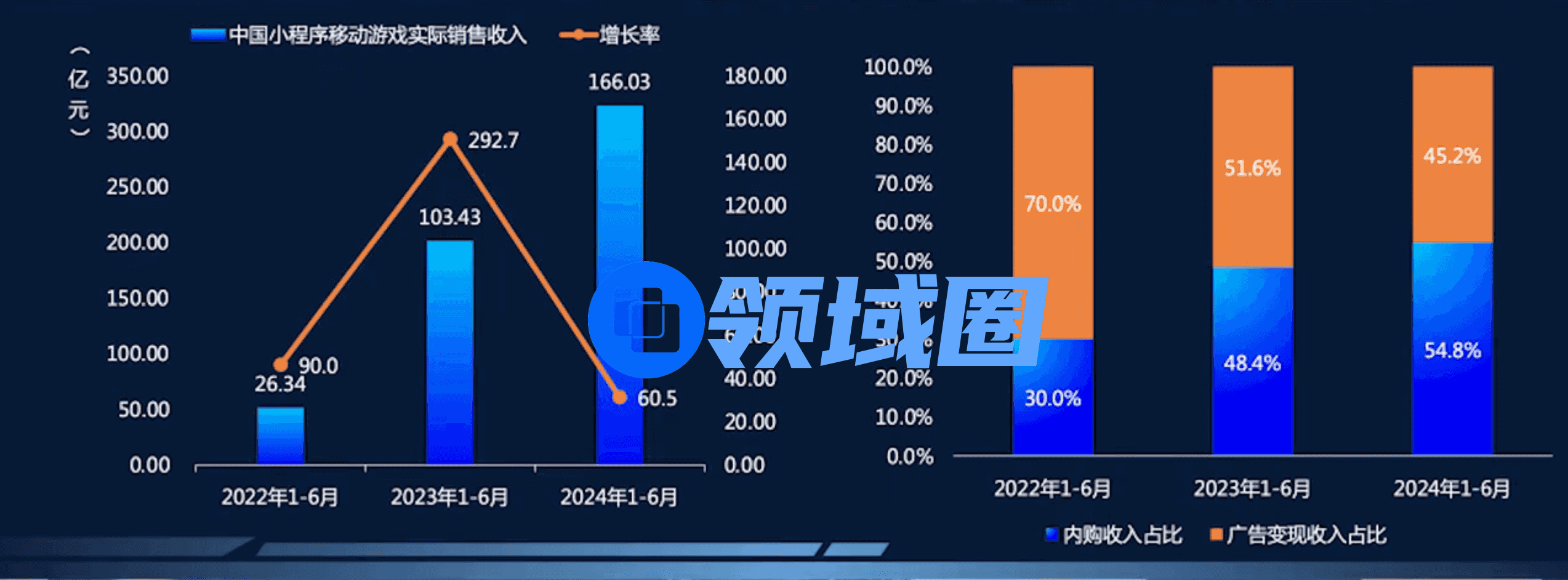 中国国际数字娱乐产业大会 ( 简称 ChinaJoy ), 公布的 《 2024年1-6月中国游戏产业报告》的最新数据 在市场层面 印证了这一趋势:小程序移动游戏以 166.03亿元的亮眼业绩,实现了60.5%的跨越式增长。其中,内购收入达90.98亿元,同比劲增81.56%;广告变现收入75.05亿元,同比增长40.75%。