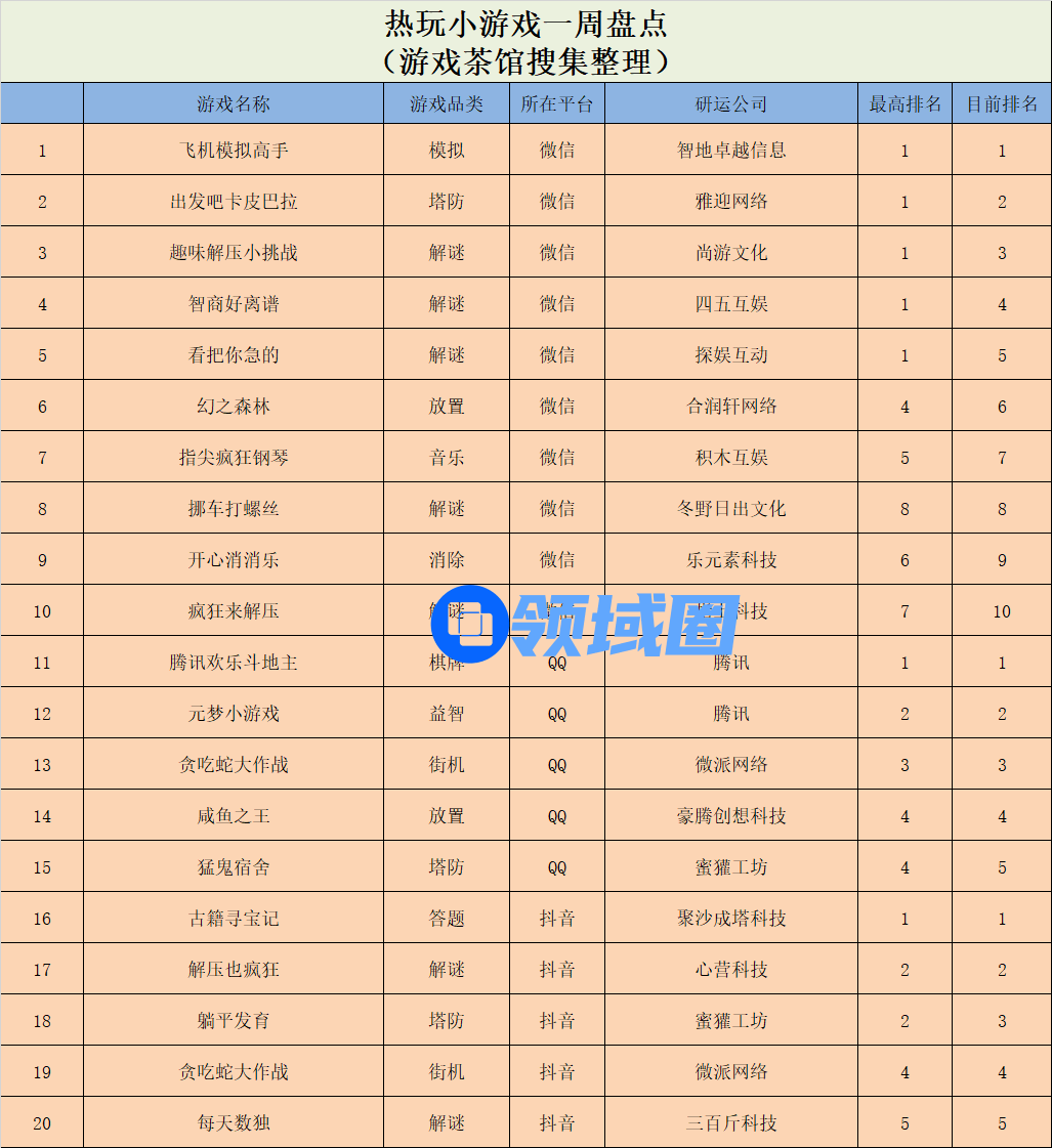 休闲新游周报每周统计微信小游戏、QQ小游戏、抖音小游戏、硬核小游戏以及App Store和Google Play上的新游爆款,并按照分类制作表格,将游戏排名情况等信息公布,希望给到行业同侪帮助。