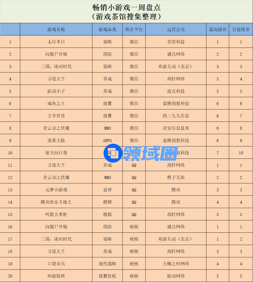 在硬核小游戏畅销榜单中,大梦龙途的塔防小游戏《向僵尸开炮》拿下魁首席位,策略游戏《三国:冰河时代》和三七互娱旗下的“开箱子游戏”《寻道大千》分别位列榜单第2和第3名。同时,放置挂机玩法的《西游除妖》本周也拿下了畅销榜TOP5的好成绩。