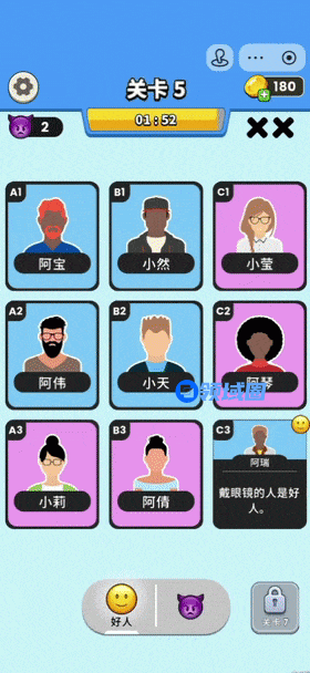其中《谁是大卧底》是一款推理玩法的解谜游戏,每个关卡会提供多个事件相关嫌疑人的卡片,翻开一个卡片后,即可获得新的线索,比如某人左右两侧的是好人,四个角落里面没有坏人之类等,玩家需要根据这些线索进行推理,最终找到真正的坏人卧底即可通关。该游戏的小游戏版本也已经上线,在抖音平台上也收获了不错的热度。