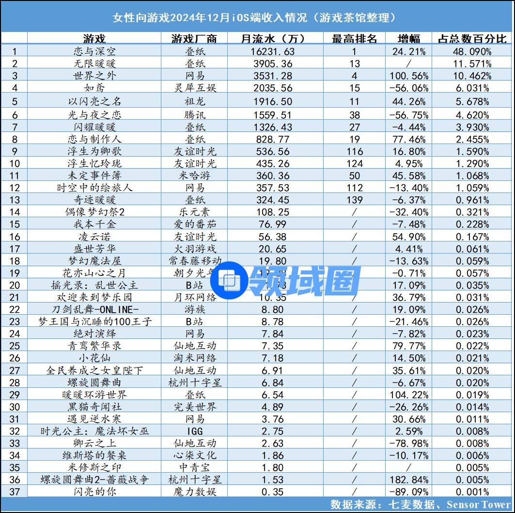注:本次数据参照七麦数据和Sensor Tower商城,统计了12月1日至12月31日期间,各大女性向游戏在iOS端收入情况,表格筛选了七麦数据iOS端游戏畅销榜TOP200、TapTap女性向游戏榜单TOP50及曾经在市面上备受关注的女性向游戏。(如有遗漏,欢迎补充)