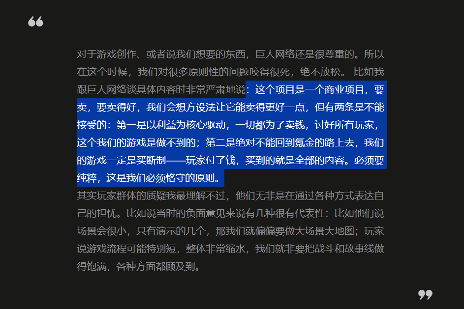 介于一些公开信息,我个人认为制作人杨洋的立项出发点大概率是买断制单机,他曾在采访中表示过:“规划之初就没细想过‘持续运营’这个概念”,而“如果要把我们所有构想的内容都做完,需要投入很多年的时间,我们不想为了缩短工期而砍掉很多内容,那会影响整体的表达”。