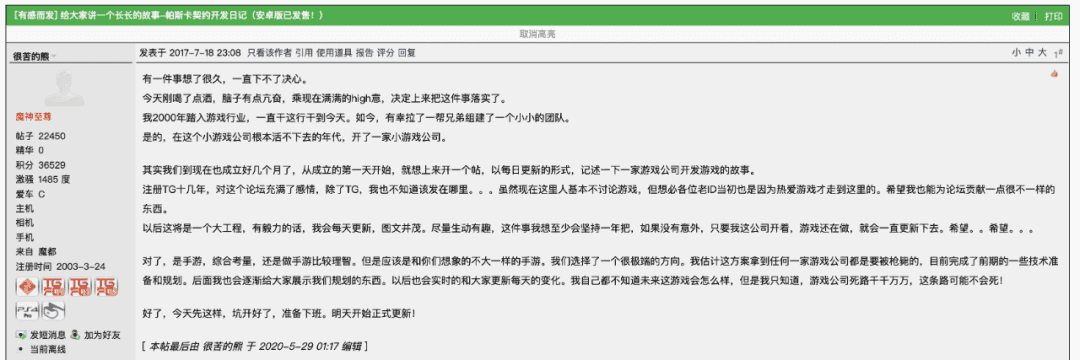 2017年,在现在已经关闭注册的TGFC论坛中,杨洋以“很苦的熊”为ID发表了名为“《帕斯卡契约》开发日记”的帖子,字里行间透露出的,是对未来满满的不确定、以及迷茫。
