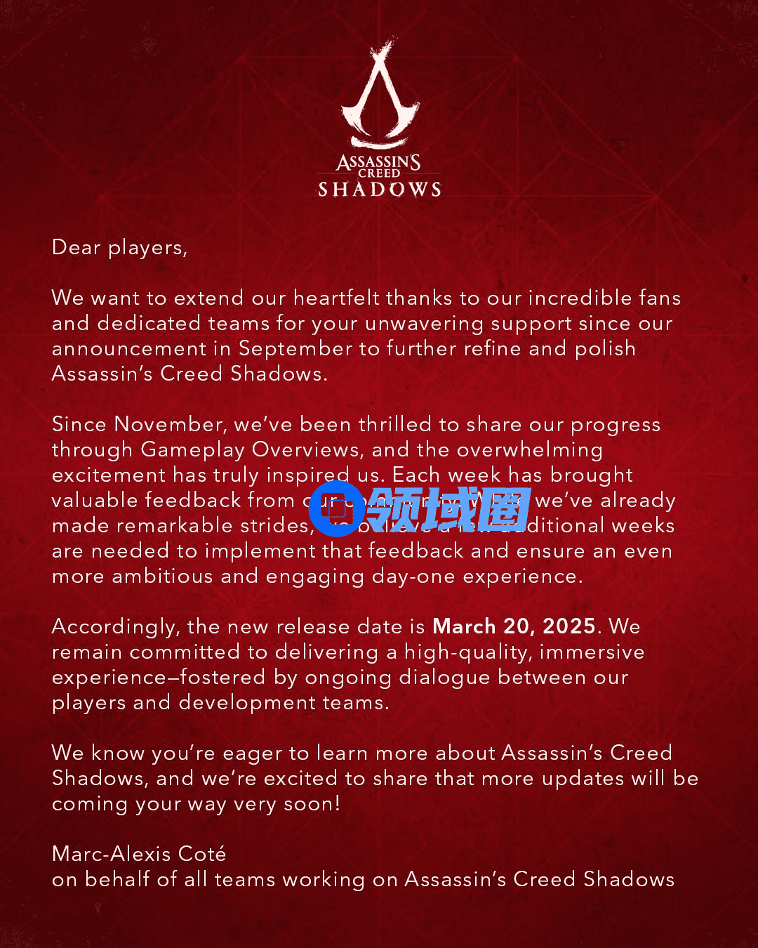 今日凌晨,育碧《刺客信条:影》宣布再次延期至2025年3月20 日。