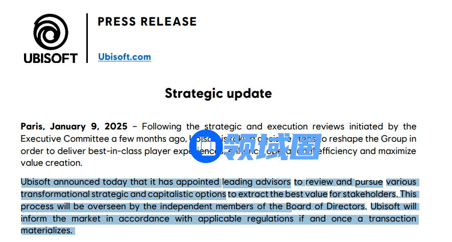 据电话会议新闻稿内容显示,除了宣布产品延期外,育碧已经已委任了有关顾问,以开启审查和寻求各种转型战略和资本选择进程。而这一过程将由董事会的独立成员监督。一旦交易实现,育碧将根据适用法规向市场通报。