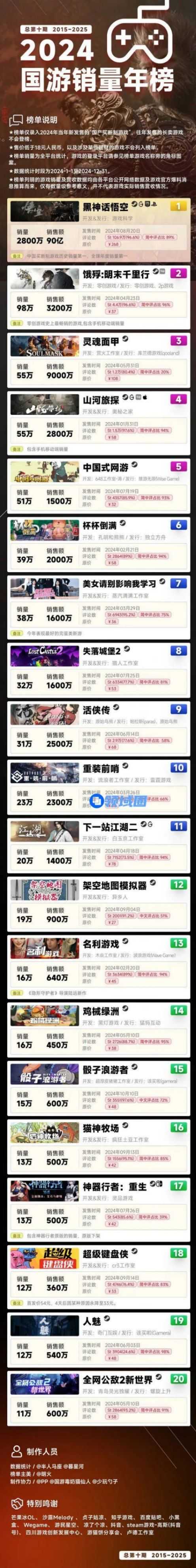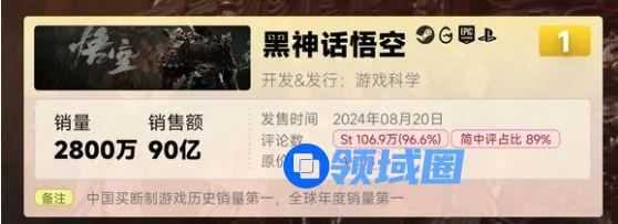 今日,国游销量吧发布了2024年国游销量年榜。其中,《黑神话:悟空》以毋庸置疑的碾压销量拔得头筹,全平台销量约2800万,销售额近90亿元。目前该游戏的评论数超过100万,好评率为96.6%,成为本年度当之无愧的国产年度游戏。