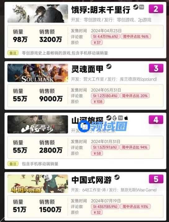 紧随其后的是国产二次元AVG游戏《饿殍:明末千里行》,以98万销量近3200万的销售额排名第二。《灵魂面甲》和《山河旅探》以55万的销量并列第三,不过考虑到《灵魂面甲》108元(海外30美元)的超高单价以及众多海外受众,因此在销售额上两者拉开了近3倍的差距。排名第五的是由WiseGame发行的整活游戏《中国式网游》,以51万的销量斩获1500万销售额。