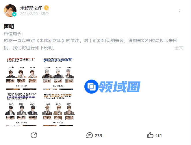 但也正在“守得云开见月明”的时刻,《米修斯》左脚刚迈进2024年,右脚便因发布的两张新年贺图卡面,陷入了“女主党”、“抄袭”的风波。