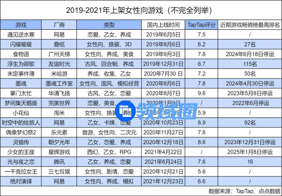 但相较光鲜一面,在2024年,更多女性向游戏因入不敷出宣布停服,包括但不限于《摇光录:乱世公主》《少女的王座》《筑梦公馆》《食物语》等。个中难题,除产品生命周期的自然衰落,也不乏经济紧张、玩家审美疲劳带来的消费欲望下降。僧多肉少,无论标注何种标签,新游的突围难度都大幅加强。