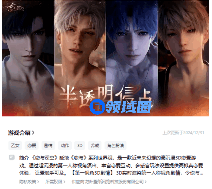 其中,2024年,《恋与深空》《世界之外》便高举“乙女恋爱”标签强势回归。其中,《恋与深空》的第一人称3D视角、主角捏脸系统,高沉浸恋爱体验直接消弭“代入党”与 “女主党”之争,成为乙游的“集大成者”,更在2024年女性向游戏市场占比遥遥领先。