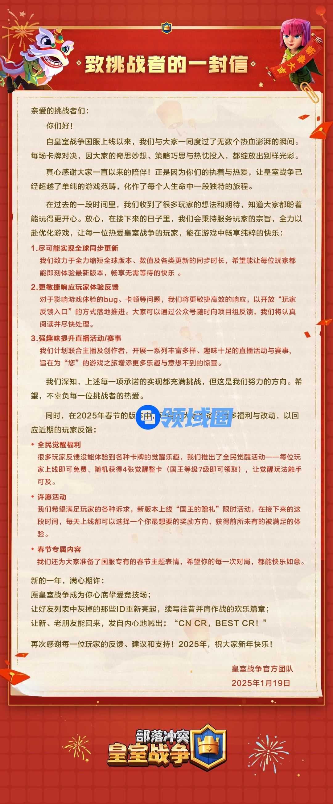 1月19日,《皇室战争》官方发布「致挑战者的一封信」。在信中,官方追忆了和挑战者们一同度过的无数个热血澎湃的瞬间,感谢了玩家们一直以来的陪伴、执着与热爱,并表示过去一段时间里,官方收到了很多玩家的想法和期待,于是诚恳复盘了皇室战争国服长期以来的运营状况,信中还透露了《皇室战争》后续的运营计划、春节活动和国服专属福利。