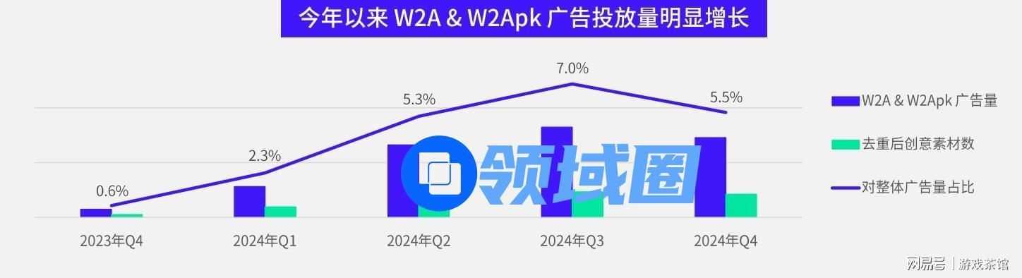 除了小游戏、副玩法买量、AIGC 等热门趋势,过去一年来 Web to App 和 Web to APK 投放方式的崛起,使得广告主可以触达 App 内广告以外的互联网流量池,由此成为移动营销新的流量破局思路。根据 AppGrowing 国际版数据监测,这两类广告投放量在过去一年呈现快速增长的趋势,Q3 在整体广告量的占比中一度达到 7%。