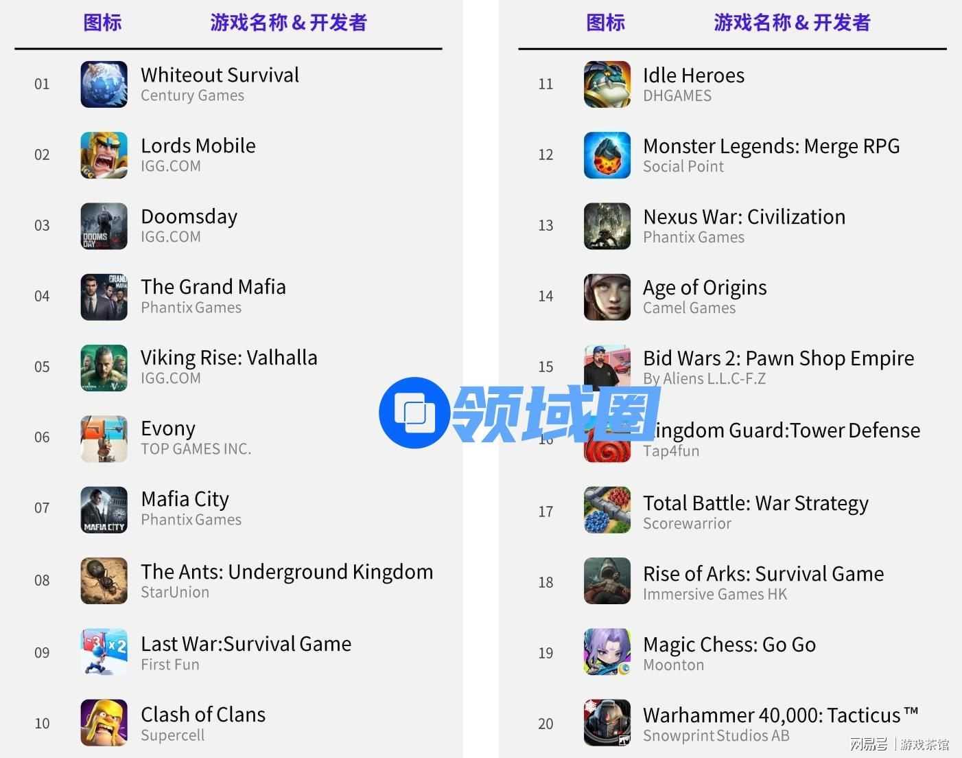 策略类是海外手游市场的主要吸金品类之一,同时也是中国厂商的优势赛道。根据 AppGrowing 国际版 数据监测,中国 SLG 厂商主导了海外策略类手游投放榜,TOP 20 超半数产品出自中国厂商之手,点点互动《Whiteout Survival》登顶投放榜,IGG 拿下榜单 TOP5 三席。