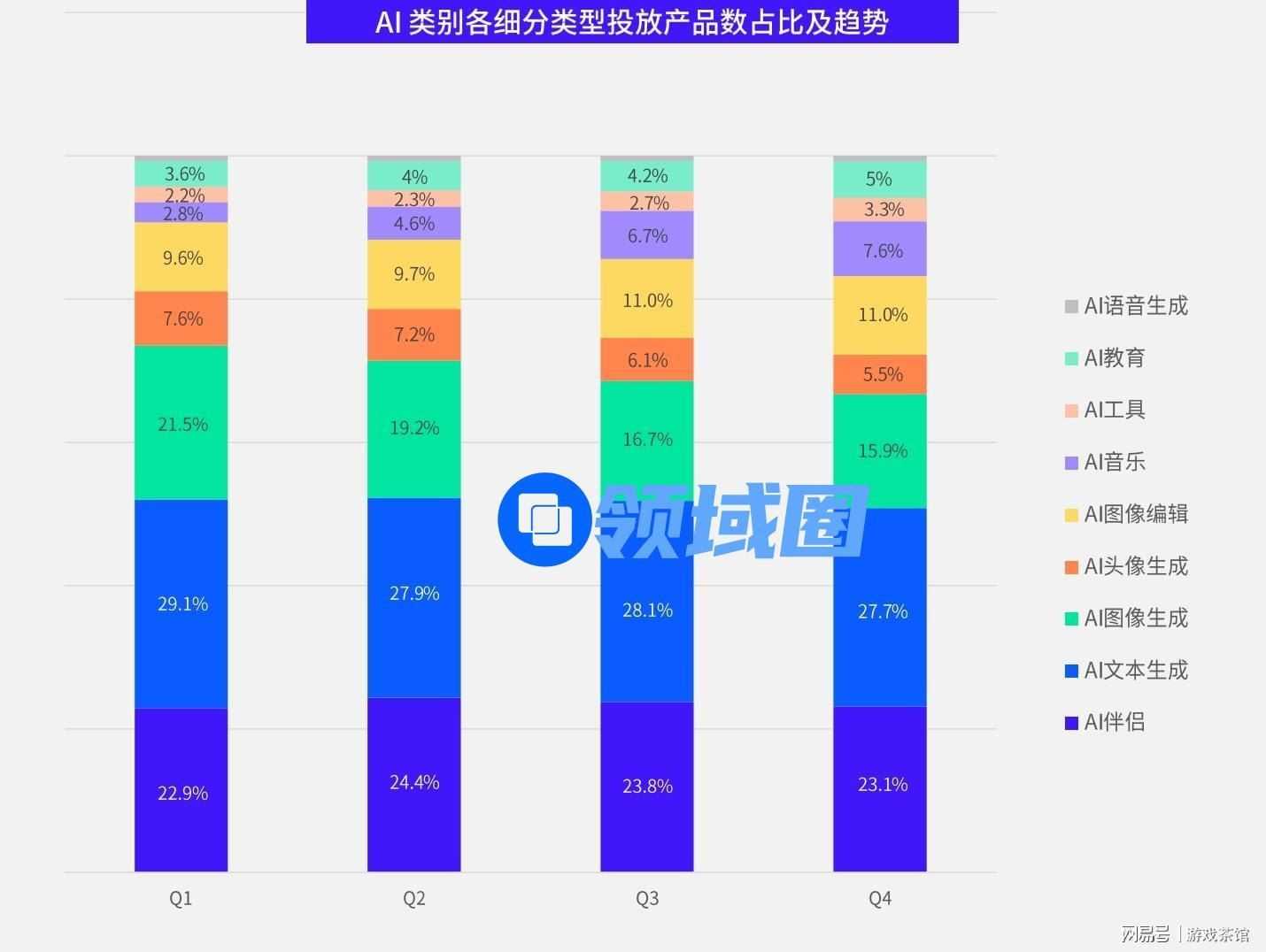 AI 类应用方面,按照季度划分,Q1 到 Q4 ,AI 类应用投放数增加了 20%。其中,AI 伴侣类产品在过去一年强势崛起,在投数自 Q2 开始保持在 23% 以上,使其成为占比第二的 AI 细分类型,足见海外用户对“情感陪伴”有着极高的需求。