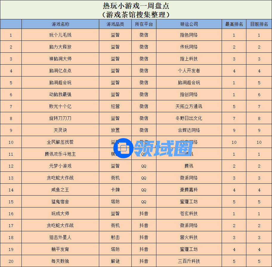 临近春节档,小游戏热玩榜单前列涌现出多款新游,其中微信小游戏人气榜单头部,仍以益智类游戏为主,其中来自指色网络的《玩个儿毛线》空降榜单魁首,另外两款益智玩法的小游戏产品《脑力大释放》和《神脑洞大师》则分别位于榜单第2和第3名.此外,模拟经营游戏《败光十个亿》本周也冲上了微信人气榜单TOP10,且其当前位于榜单第7名。