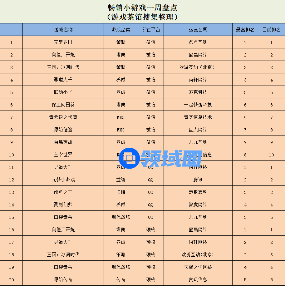 在硬核小游戏畅销榜单中,大梦龙途的塔防小游戏《向僵尸开炮》又一周拿下榜单魁首,三七互娱旗下的《寻道大千》和策略游戏《三国:冰河时代》分别位列榜单第2和第3名。同时,贪玩游戏旗下的传奇游戏《原始传奇》本周也拿下了畅销榜TOP5的好成绩。