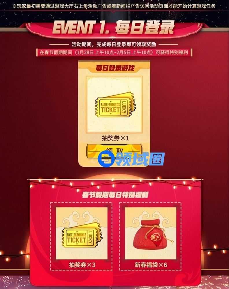 活动1:每日登录:活动期间,玩家每天登录游戏即可领取抽奖券,春节(1月28日10:00-2月5日10:00)期间登录还可额外获得新春福袋;