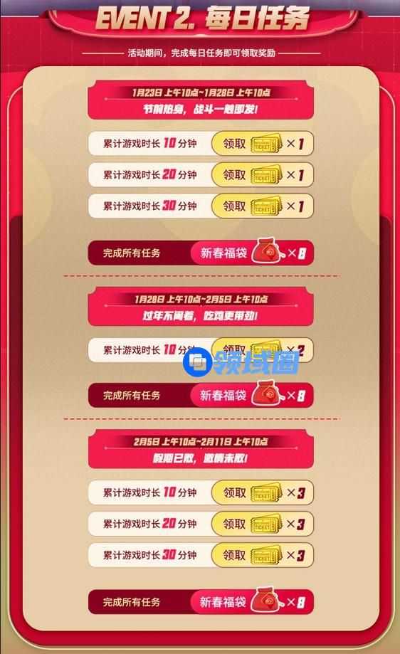 活动2:每日任务:完成每日设定的游戏时长任务,获得抽奖券的同时,还可获得新春福袋;