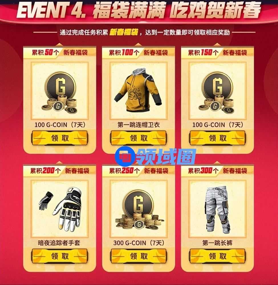 活动4:福袋满满 吃鸡贺新春:积累新春福袋,可兑换多款珍稀道具和皮肤。首次上线的连帽卫衣,长裤和暗夜追踪者手套让你的角色焕然一新,迎接新春的到来。