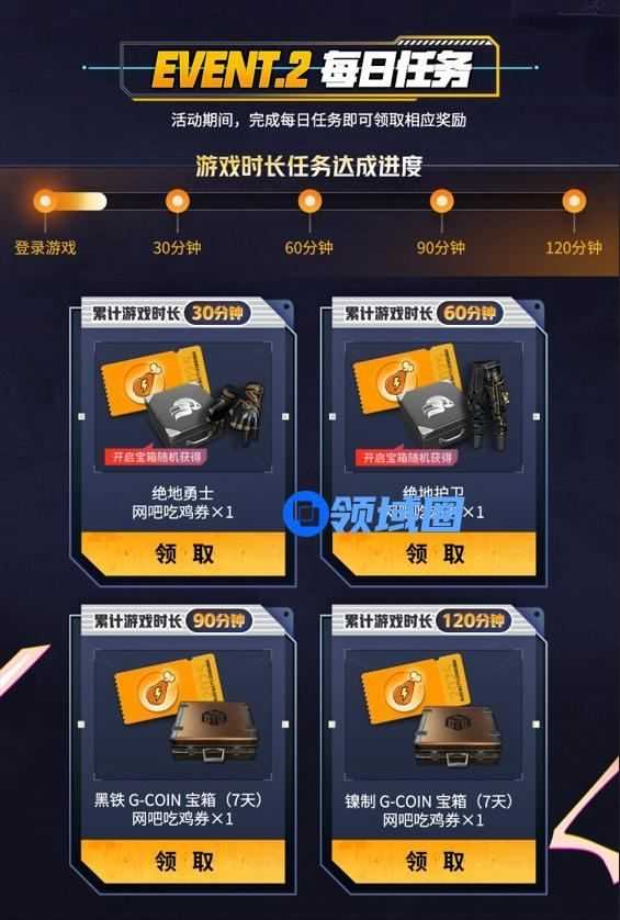 活动2:每日任务:完成每日设定的游戏时长任务,即可获得网吧吃鸡券及游戏宝箱,宝箱中有可能开出游戏道具!