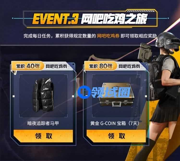 活动3:网吧吃鸡之旅:积累网吧吃鸡券,可兑换新上线皮肤暗夜追踪者马甲及黄金宝箱。