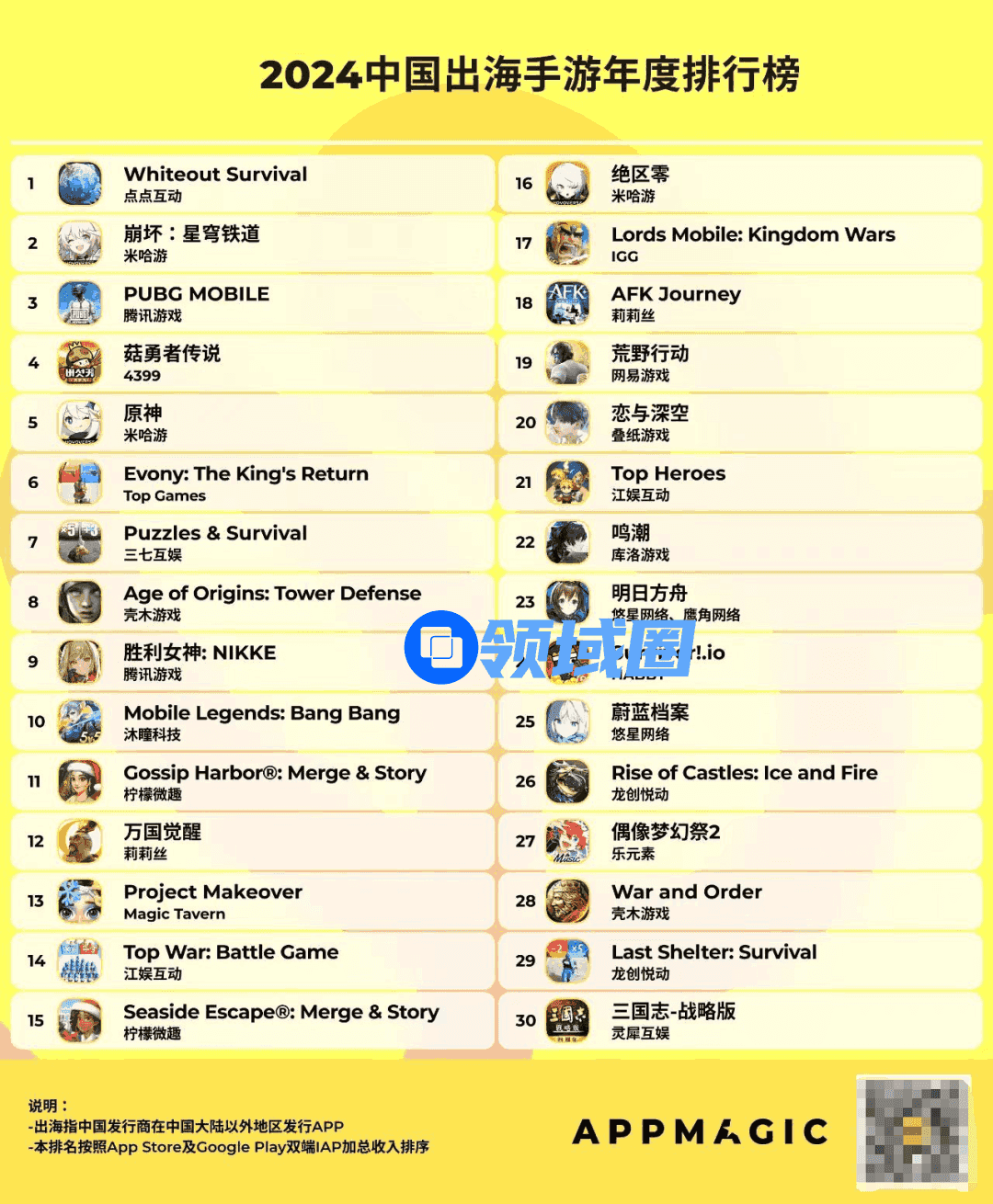 据AppMagic2024年中国出海手游排行榜,《Age of Origins》和《War and Order》分别排名第8和第28。其中,末日题材SLG《Age of Origins》在2018年上线,上线已超6年,自2022年5月起便成为Sensor Tower中国手游收入榜Top10的常客,成为国内出海头部产品之一。而自2016年上线的《War and Order》出海成绩也稳健依旧。