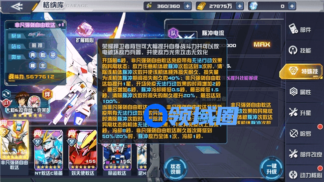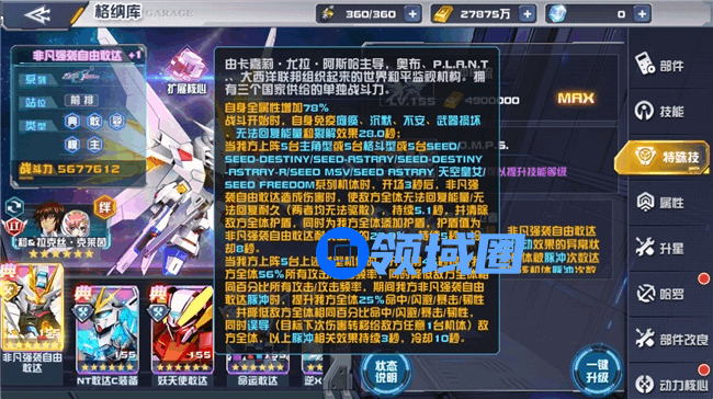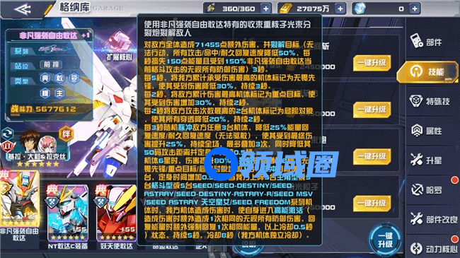 设定如此强劲的机体,非凡强袭自由敢达在游戏中的表现也自然是不容小觑。技能在体现机体各种特色武装的基础上效果也是相当强劲,除了作为seed系列的最终机体给同系列机体提供的强大加成,单体作战能力也是堪称一绝。