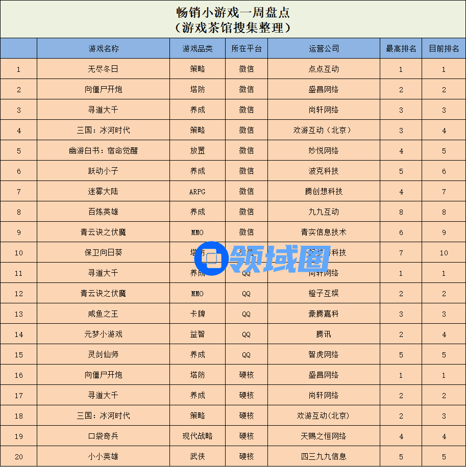 在硬核小游戏畅销榜单中,大梦龙途的塔防小游戏《向僵尸开炮》持续稳坐榜单魁首,三七互娱旗下的《寻道大千》和策略游戏《三国:冰河时代》分别位列榜单第2和第3名。同时,四三九九信息旗下的武侠游戏《小小英雄》本周也拿下了畅销榜TOP5的好成绩。