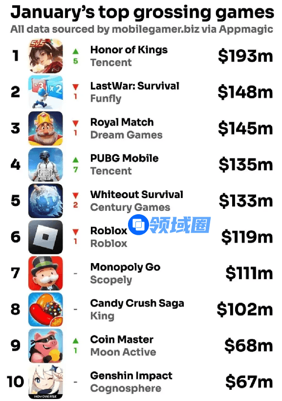 《Garena 传说对决》是《王者荣耀》的国际服。作为全球最吸金的手游IP,在App Magic统计的2024年全球手游收入榜中,腾讯MOBA手游《王者荣耀》以1930亿美元的年收入登顶。在刚过去的1月,随着全新版本和新英雄比洛尔的推出,该款游戏双端全球营收也环比增长9000万美元,重返榜首。