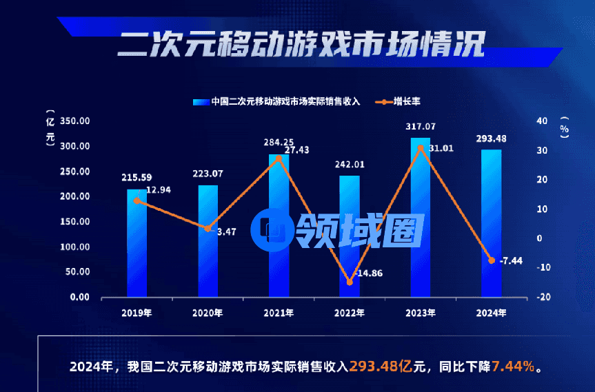 《2024中国游戏产业报告》,2024年国内二次元手游实际收益293.48亿元,同比大幅下滑7.44%
