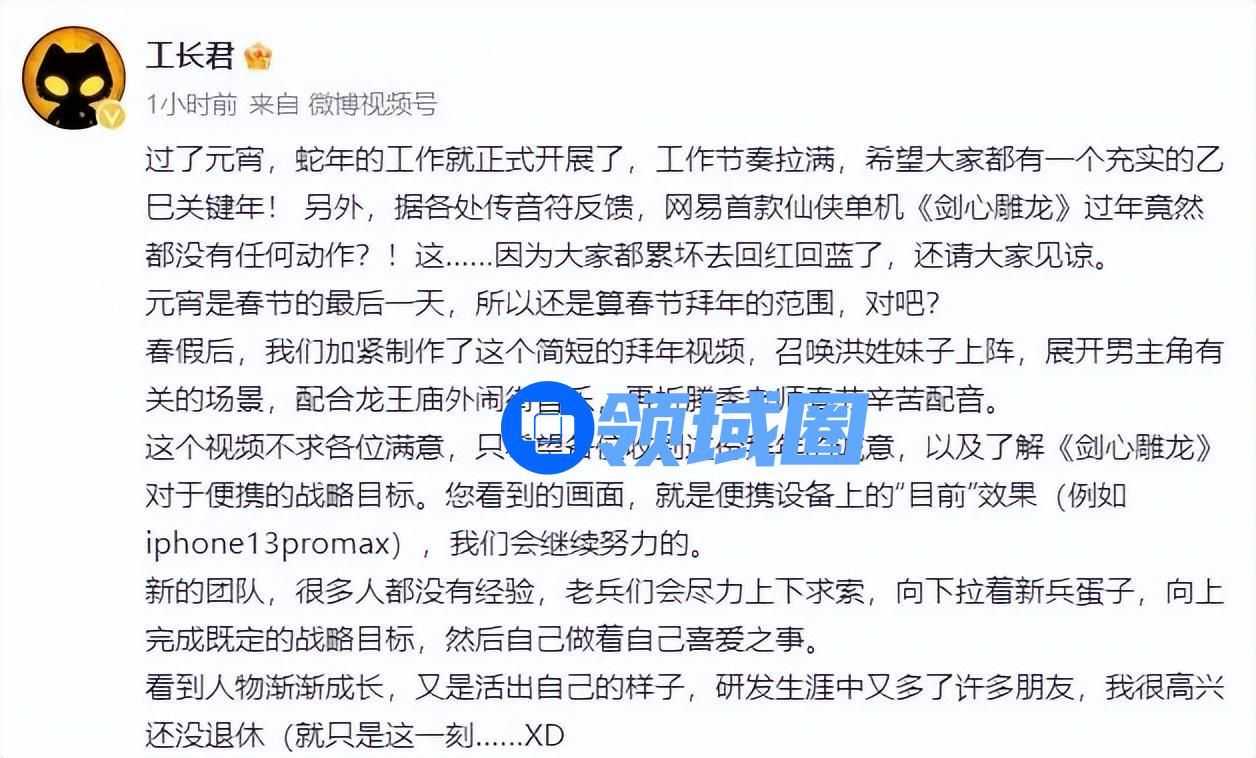 作为游戏开发的主要制作人,网易的工长君也同样发布了微博动态,透露了一些关于游戏开发的关键信息,具体内容如下: