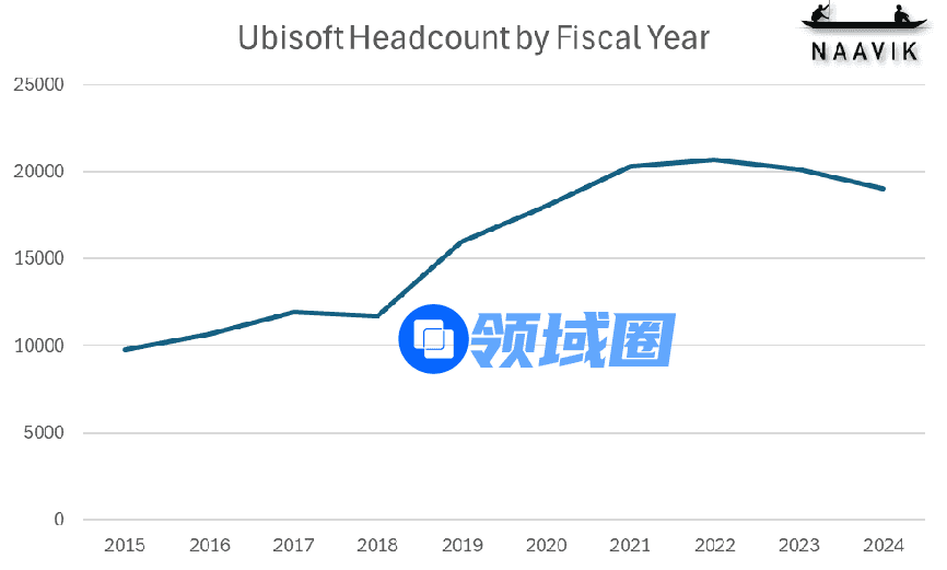 用工成本是其中最大的一部分。尽管裁员是近些年游戏行业的主旋律,但育碧一直不愿进行大规模裁员。据育碧公开的数据显示,从2015年到2024年,这家公司的员工扩充了1万余人。