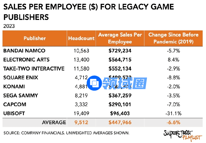 这和人数其实无关,因为万代南梦宫和EA以及T2也有着过万的员工,但这些公司的人均创收是育碧的近七八倍。