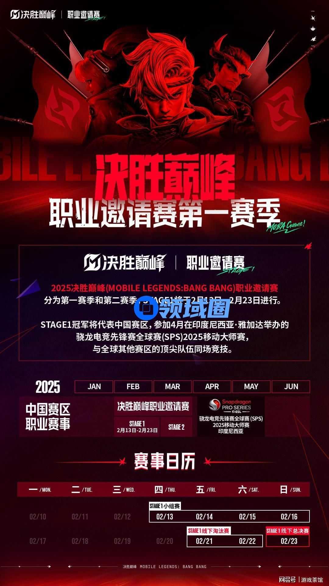 2月13日,2025 决胜巅峰(MOBILE LEGENDS: BANG BANG)职业邀请赛第一赛季正式开启。作为决胜巅峰中国赛区首个官方职业邀请赛,本次赛事分为两个赛季,STAGE1于今日至2月23日进行,冠军战队将代表中国赛区,参加4月在印度尼西亚雅加达举办的骁龙电竞先锋赛全球赛(SPS)2025移动大师赛,与全球顶尖队伍同场竞技。