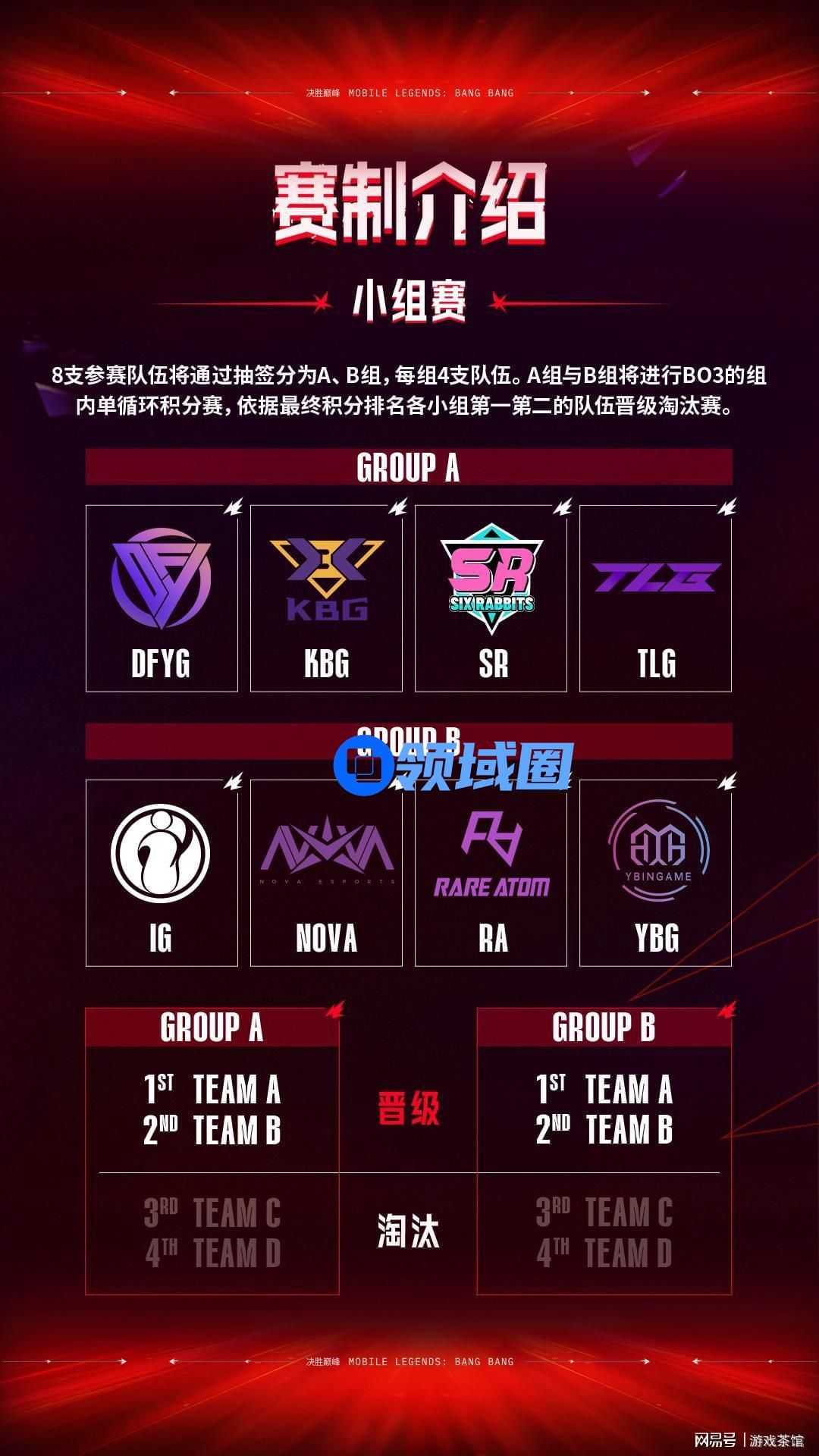 8支参赛战队中,DFYG、KBG、IG、RA为直邀战队,SR、TLG、NOVA、YBG通过海选脱颖而出。小组赛阶段,8支队伍抽签分为A、B两组,每组4队进行BO3组内单循环积分赛,小组第一晋级淘汰赛。淘汰赛采用BO5和BO7赛制,最终决出冠军。