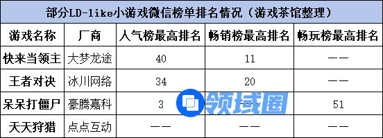 比如冰川网络的《王者对决》、豪腾嘉科的《呆呆打僵尸》、点点互动的《天天狩猎》和大梦龙途的《快来当领主》,《快来当领主》是其中表现最为突出的产品之一。