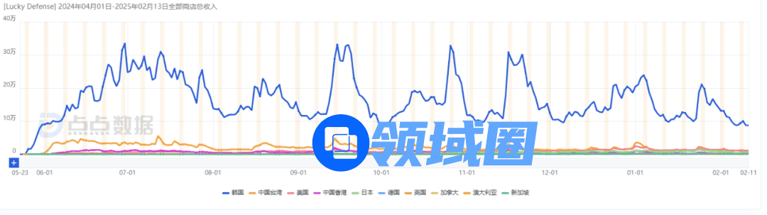 分析两款游戏的玩法原型《Lucky Defense!》在全球市场的表现数据可以发现,虽然该游戏全球累计营收已达5600万美元(约合人民币4亿元),但收入分布极不均衡。其中,韩国市场贡献了77.86%的营收,占据绝对主导地位;排名第二的台湾地区仅占9.84%;而港澳台新马五个地区的平均月收入仅为600万元。