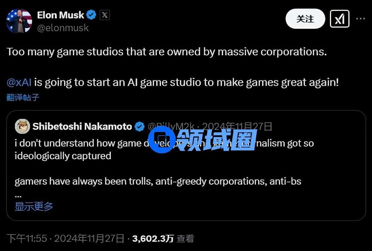 去年11月,马斯克首次透露xAI 将成立一家 AI 游戏工作室。原贴中,他针对网友所认为的游戏生态存在被“意识形态控制”的情况,表示想要“让游戏再次伟大” 。