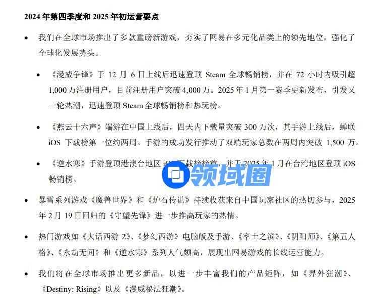 根据财报信息显示,网易去年在全球市场推出了多款重磅新游,夯实了网易在多元化品类的领先地位,强化了全球发展的势头。