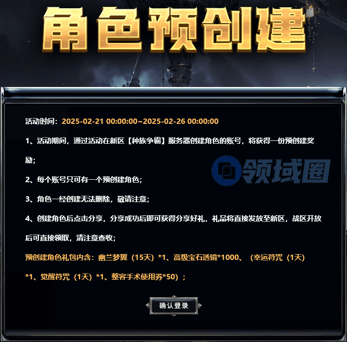 活动期间,通过活动在新区【种族争霸】服务器创建角色的账号,将获得一份预创建奖励;