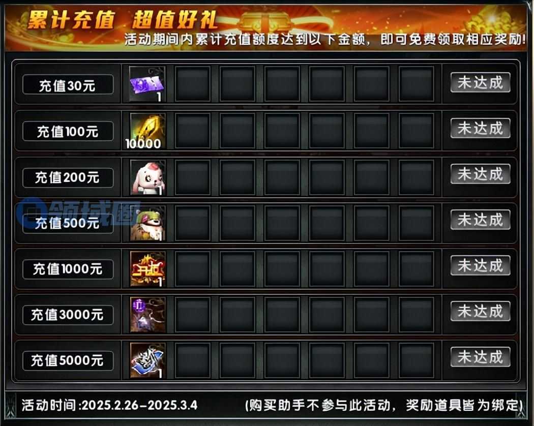 活动期间在新区种族争霸进行充值,累计充值金额到达不同的档位可以获得不同的奖励。