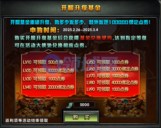 活动期间内购买开服基金,活动结束后可到【活动大使】处获得超值返利,每达到10、20、30、40、50、60、70、80、90级时都可领取不同数额的返还点券或者绑定点券,让坎特拉之路更加顺畅。