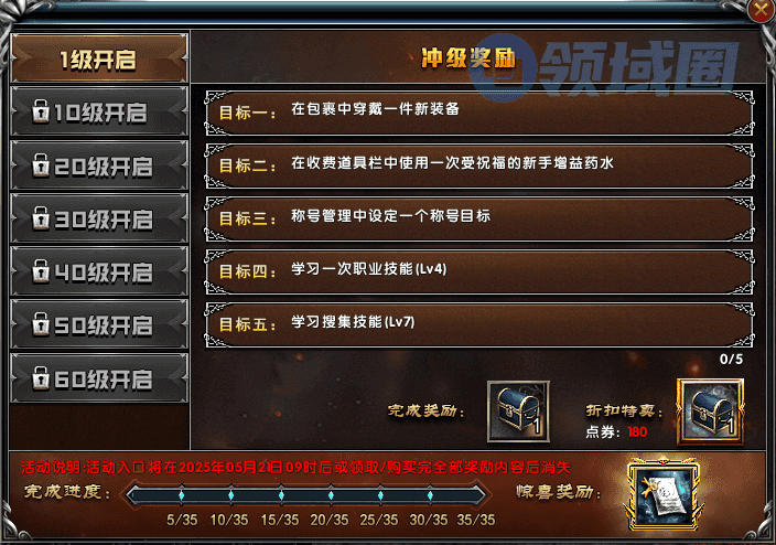 新区创建角色,每当角色达到1、10、20、30、40、50、60级并完成相应的目标时,会免费获得对应的等级礼包,同时也可以购买超值折扣礼包。