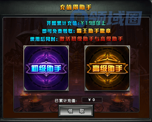 活动期间内累计充值金额超过198,即可免费获得霸王助手徽章,使用后可同时开启30天霸王初级、高级助手功能,包括自动修复道具耐久度、自动售卖、一键修理等功能。徽章不可重复获得,每人仅可获得一次。