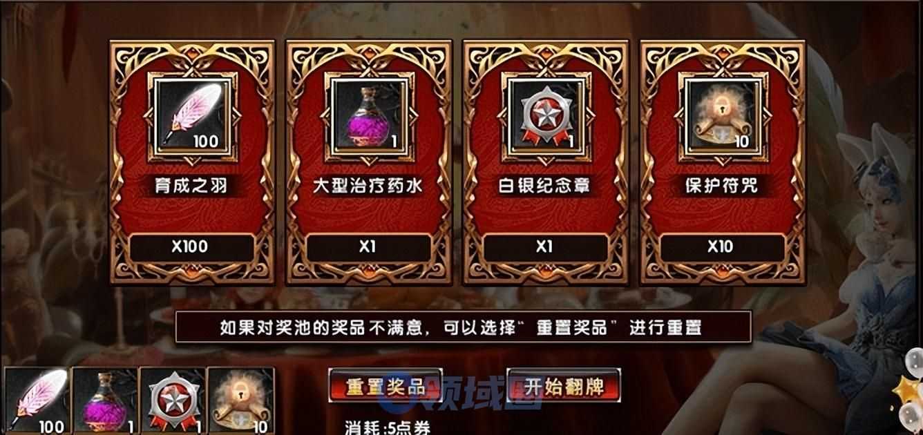 2、 可直接选择“放弃”按钮或消耗点券选择“重置”按钮重置四张卡牌的奖励内容;