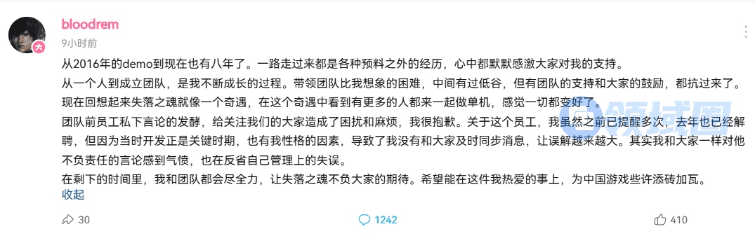 今日凌晨1时许,定档5月30日发售的国产ARPG《失落之魂》制作人杨冰,就前员工不当言论引发的舆论风波做出回应,表示该员工已被解聘,并坦言“也在反省自己管理上的失误”。