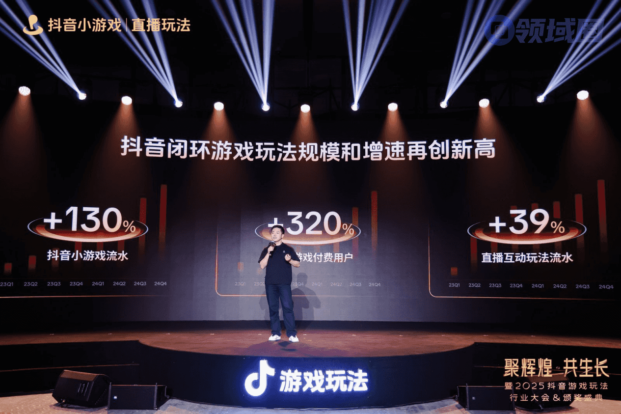随后,作为平台方业务总负责人,林克分享了一组数据,更让大家看到了抖音游戏玩法行业的巨大潜力。目前,抖音闭环游戏玩法无论在规模上还是增速上都再创新高,抖音小游戏流水增幅达130%,付费用户增加320%;直播互动玩法流水也有39%的增长。